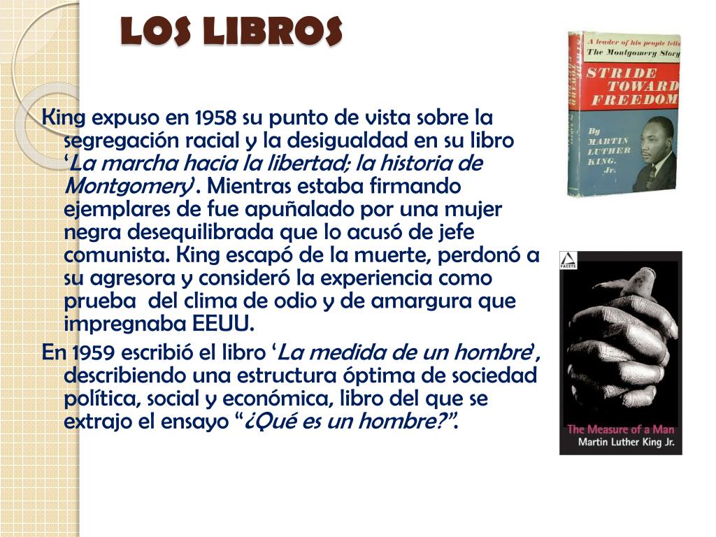 LOS LIBROS King expuso en 1958 su punto de vista sobre la segregación racial y la desigualdad en su libro ‘La marcha hacia la libertad; la historia de Montgomery’. Mientras estaba firmando ejemplares de fue apuñalado por una mujer negra desequilibrada que lo acusó de jefe comunista. King escapó de la muerte, perdonó a su agresora y consideró la experiencia como prueba del clima de odio y de amargura que impregnaba EEUU. En 1959 escribió el libro ‘La medida de un hombre’, describiendo una estructura óptima de sociedad política, social y económica, libro del que se extrajo el ensayo “¿Qué es un hombre?”.