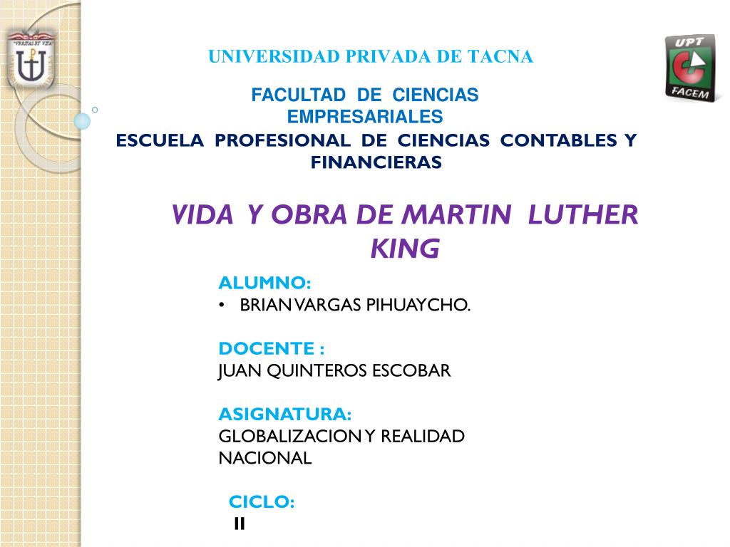 UNIVERSIDAD PRIVADA DE TACNA . FACULTAD DE CIENCIAS EMPRESARIALES . ESCUELA PROFESIONAL DE CIENCIAS CONTABLES Y FINANCIERAS. VIDA Y OBRA DE MARTIN LUTHER KING. ALUMNO: BRIAN VARGAS PIHUAYCHO. DOCENTE : JUAN QUINTEROS ESCOBAR ASIGNATURA: GLOBALIZACION Y REALIDAD NACIONAL