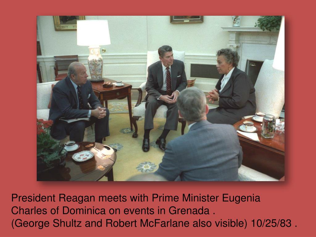 President Reagan meets with Prime Minister Eugenia Charles of Dominica on events in Grenada . (George Shultz and Robert McFarlane also visible) 10/25/83 .