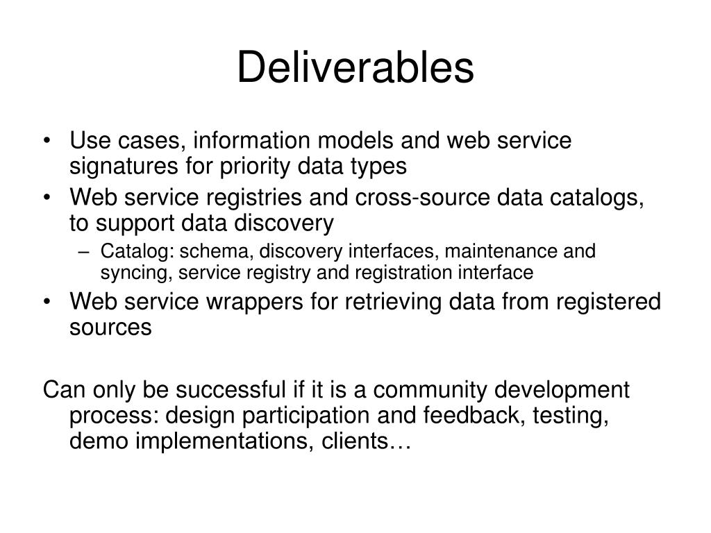 Deliverables • Use cases, information models and web service signatures for priority data types • Web service registries and cross-source data catalogs, to support data discovery • Catalog: schema, discovery interfaces, maintenance and syncing, service registry and registration interface • Web service wrappers for retrieving data from registered sources Can only be successful if it is a community development process: design participation and feedback, testing, demo implementations, clients…