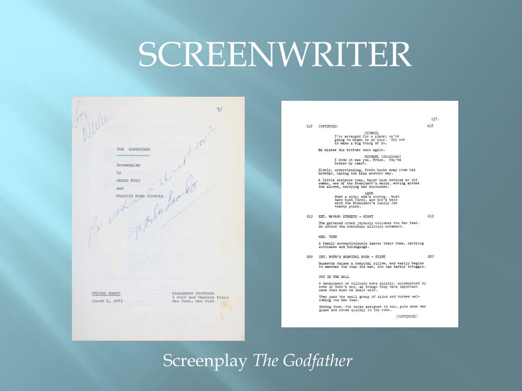 CINEMA & FILM. DO YOU KNOW FILM PROFESIONS?. Film crew. DIRECTOR. Quentin Tarantino. Woody Allen. Alejandro Amenabar. PRODUCER. Steven Spielberg : producer, film director, screenwriter, video game designer and studio entrepreneur. SCREENWRITER. Screenplay The Godfather.