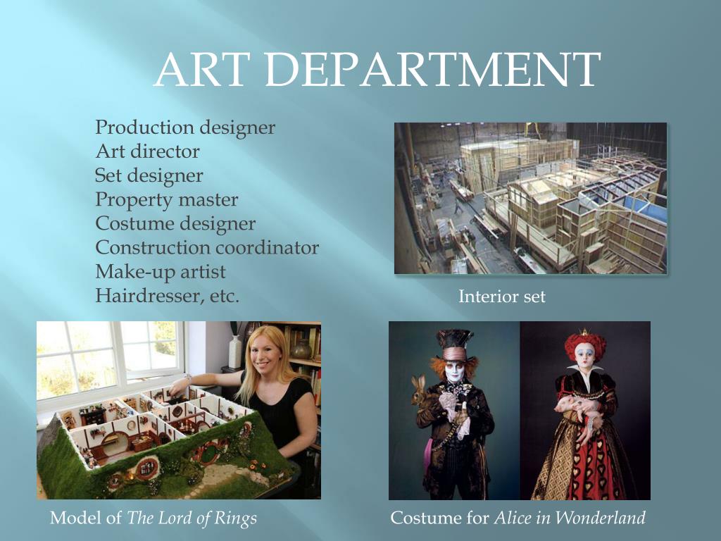 ART DEPARTMENT Production designer Art director Set designer Property master Costume designer Construction coordinator Make-up artist Hairdresser, etc. Interior set Model of The Lord of Rings Costume for Alice in Wonderland