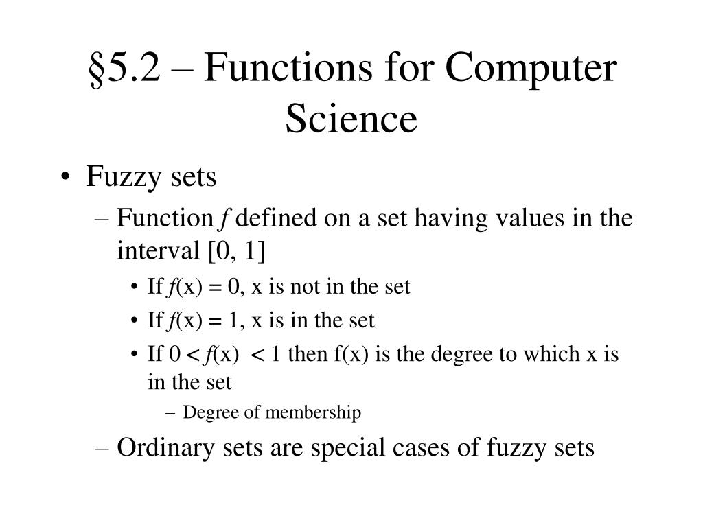 §5.2 – Functions for Computer Science • Fuzzy sets • Function f defined on a set having values in the interval [0, 1] • If f(x) = 0, x is not in the set • If f(x) = 1, x is in the set • If 0 < f(x) < 1 then f(x) is the degree to which x is in the set • Degree of membership • Ordinary sets are special cases of fuzzy sets