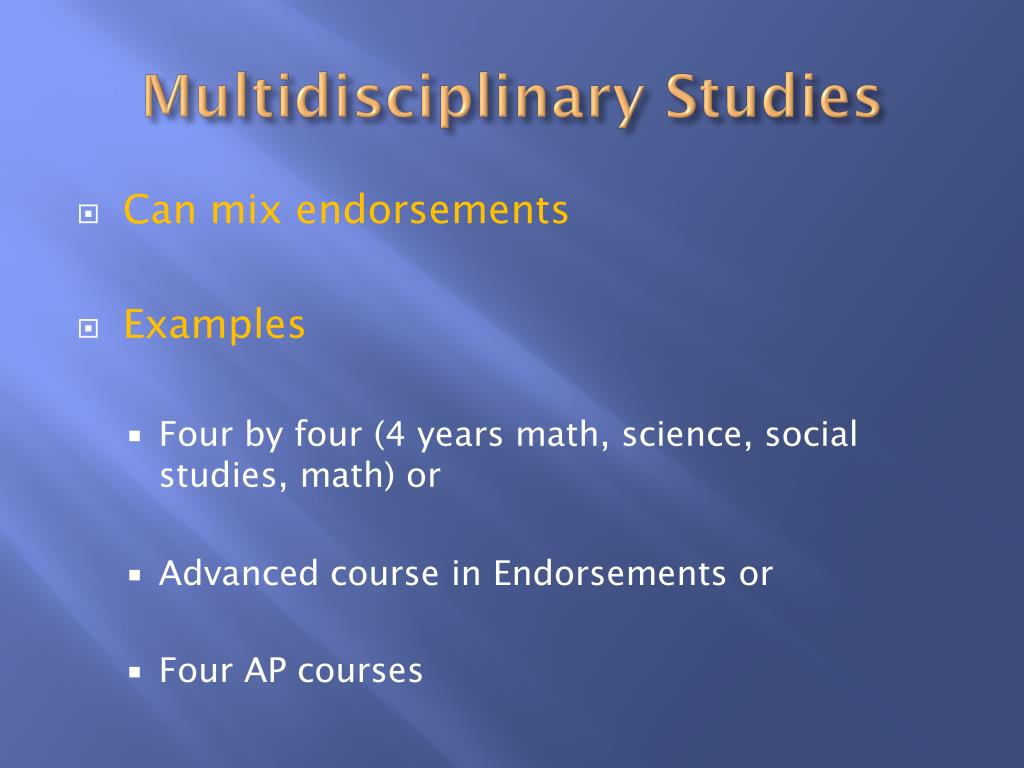 Multidisciplinary Studies • Can mix endorsements • Examples • Four by four (4 years math, science, social studies, math) or • Advanced course in Endorsements or • Four AP courses