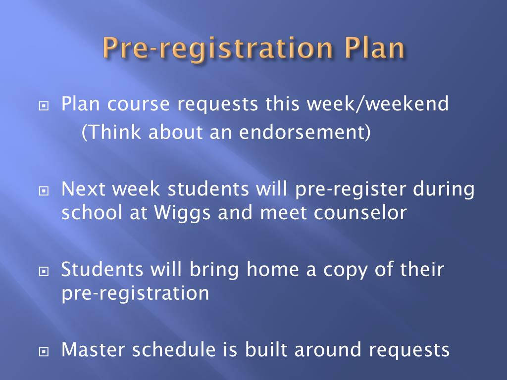 Pre-registration Plan • Plan course requests this week/weekend (Think about an endorsement) • Next week students will pre-register during school at Wiggsand meet counselor • Students will bring home a copy of their pre-registration • Master schedule is built around requests