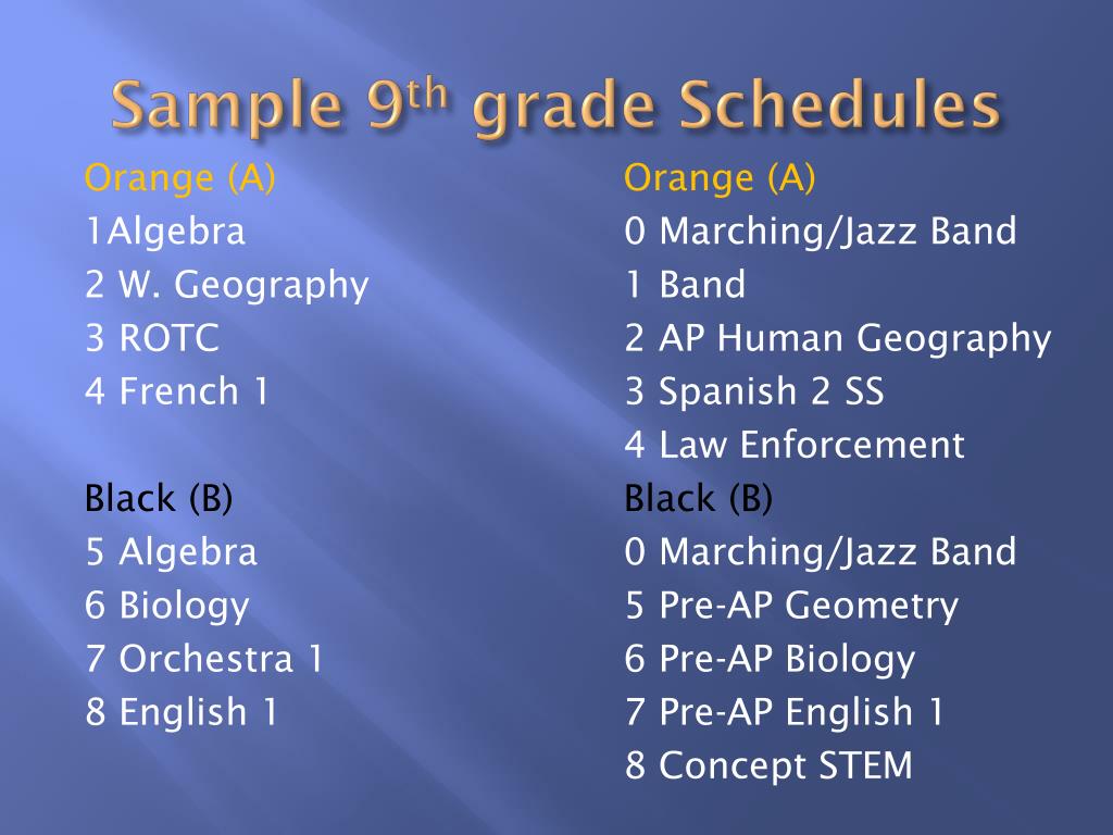 Sample 9th grade Schedules Orange (A) Orange (A) 1Algebra 0 Marching/Jazz Band 2 W. Geography 1 Band 3 ROTC 2 AP Human Geography 4 French 1 3 Spanish 2 SS 4 Law Enforcement Black (B) Black (B) 5 Algebra 0 Marching/Jazz Band 6 Biology 5 Pre-AP Geometry 7 Orchestra 1 6 Pre-AP Biology 8 English 1 7 Pre-AP English 1 8 Concept STEM