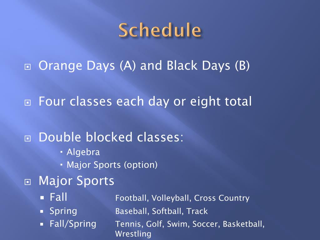 Schedule • Orange Days (A) and Black Days (B) • Four classes each day or eight total • Double blocked classes: • Algebra • Major Sports (option) • Major Sports • Fall Football, Volleyball, Cross Country • Spring Baseball, Softball, Track • Fall/Spring Tennis, Golf, Swim, Soccer, Basketball, Wrestling