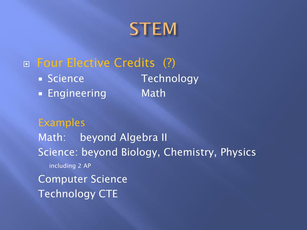 STEM • Four Elective Credits (?) • Science Technology • Engineering Math Examples Math: beyond Algebra II Science: beyond Biology, Chemistry, Physics including 2 AP Computer Science Technology CTE
