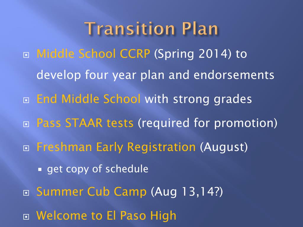 Transition Plan • Middle School CCRP (Spring 2014) to develop four year plan and endorsements • End Middle School with strong grades • Pass STAAR tests (required for promotion) • Freshman Early Registration (August) • get copy of schedule • Summer Cub Camp (Aug 13,14?) • Welcome to El Paso High