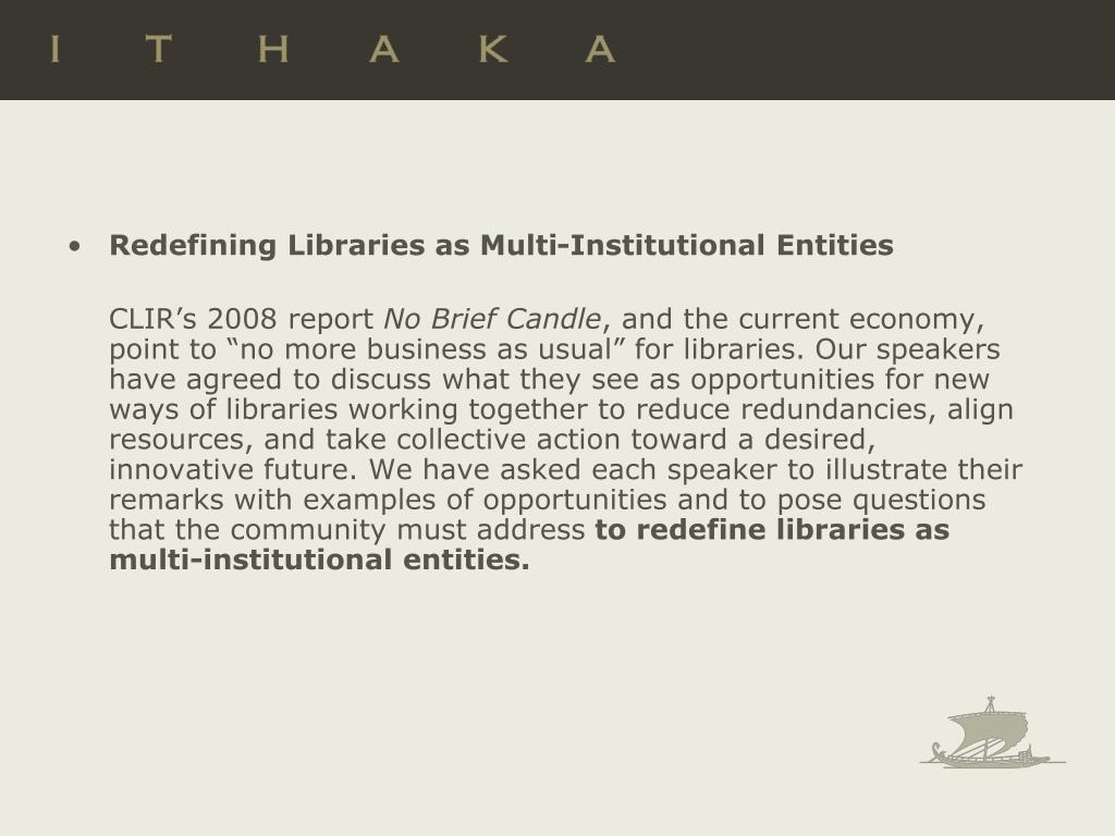 Redefining Libraries as Multi-Institutional Entities CLIR’s 2008 report No Brief Candle, and the current economy, point to “no more business as usual” for libraries. Our speakers have agreed to discuss what they see as opportunities for new ways of libraries working together to reduce redundancies, align resources, and take collective action toward a desired, innovative future. We have asked each speaker to illustrate their remarks with examples of opportunities and to pose questions that the community must address to redefine libraries as multi-institutional entities.