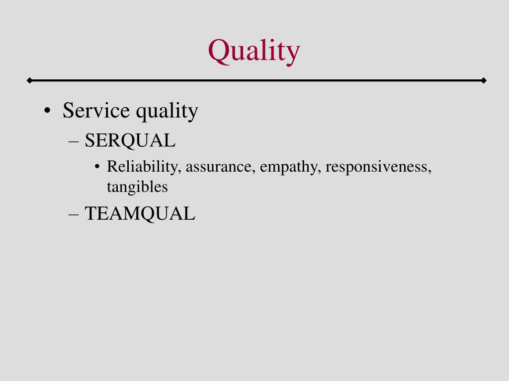 Quality • Service quality • SERQUAL • Reliability, assurance, empathy, responsiveness, tangibles • TEAMQUAL