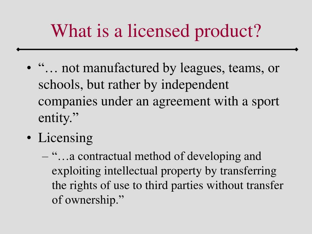 What is a licensed product? • “… not manufactured by leagues, teams, or schools, but rather by independent companies under an agreement with a sport entity.” • Licensing • “…a contractual method of developing and exploiting intellectual property by transferring the rights of use to third parties without transfer of ownership.”