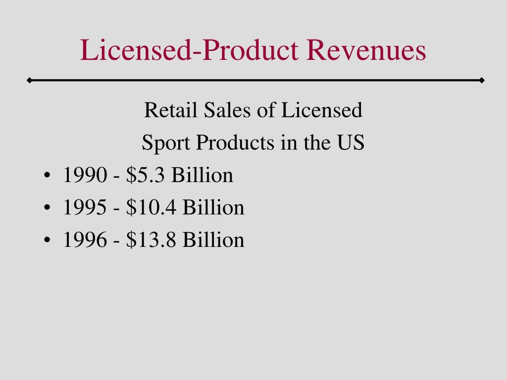 Licensed-Product Revenues Retail Sales of Licensed Sport Products in the US • 1990 - $5.3 Billion • 1995 - $10.4 Billion • 1996 - $13.8 Billion