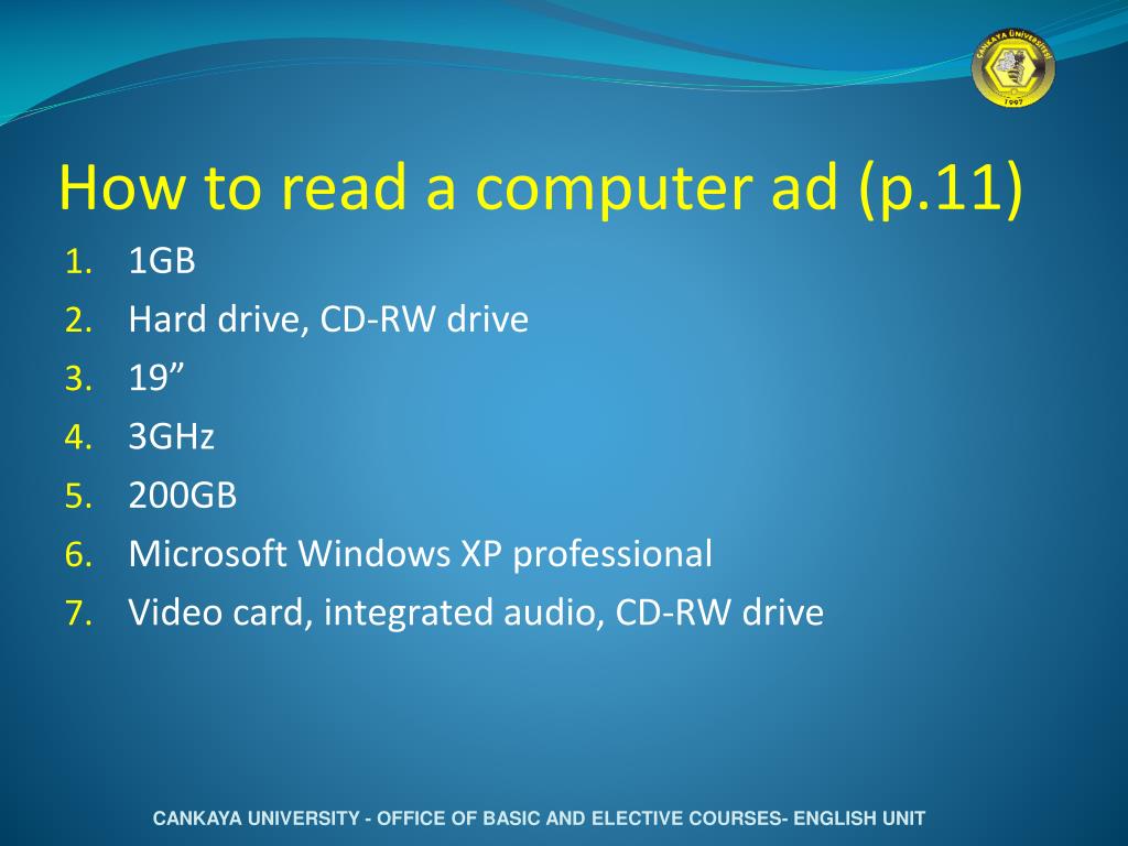 Howtoread a computer ad (p.11) • 1GB • Hard drive, CD-RW drive • 19” • 3GHz • 200GB • Microsoft Windows XP professional • Video card, integratedaudio, CD-RW drive