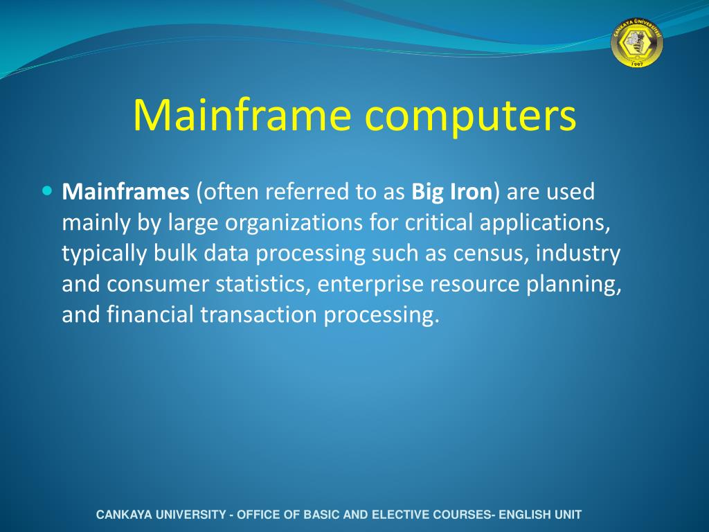 Mainframecomputers • Mainframes (often referred to as Big Iron) are used mainly by large organizations for critical applications, typically bulk data processing such as census, industry and consumer statistics, enterprise resource planning, and financial transaction processing.