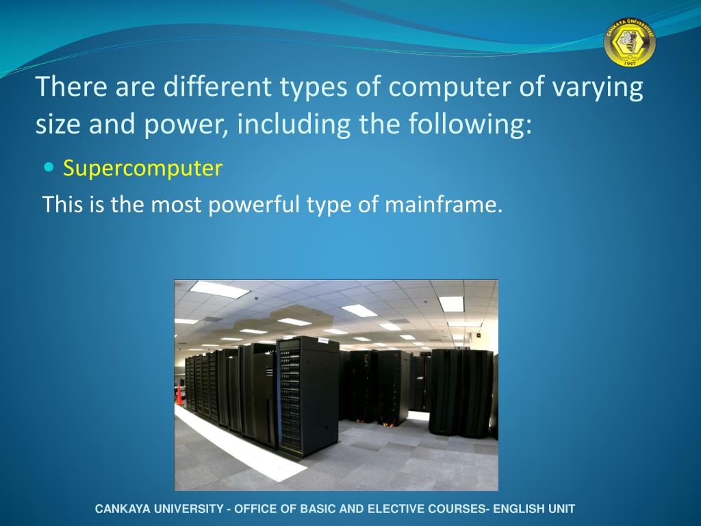 Therearedifferenttypes of computer of varying size andpower, includingthefollowing: • Supercomputer This is themostpowerfultype of mainframe.