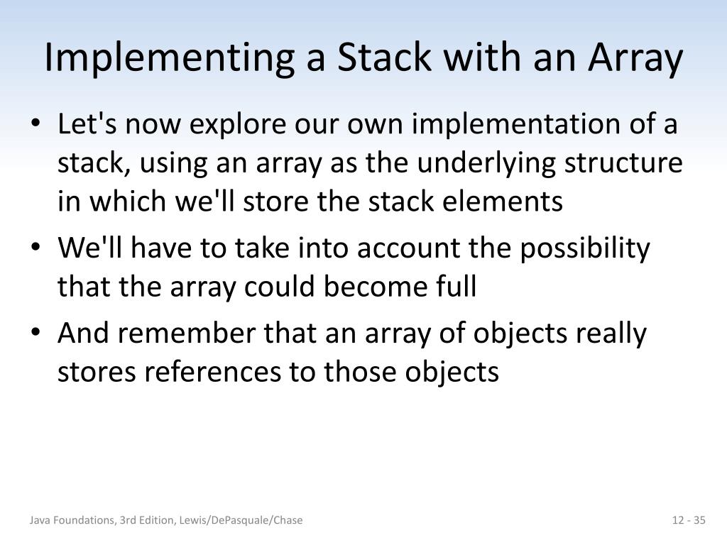 Implementing Stacks with an Array • An array of object references: Java Foundations, 3rd Edition, Lewis/DePasquale/Chase