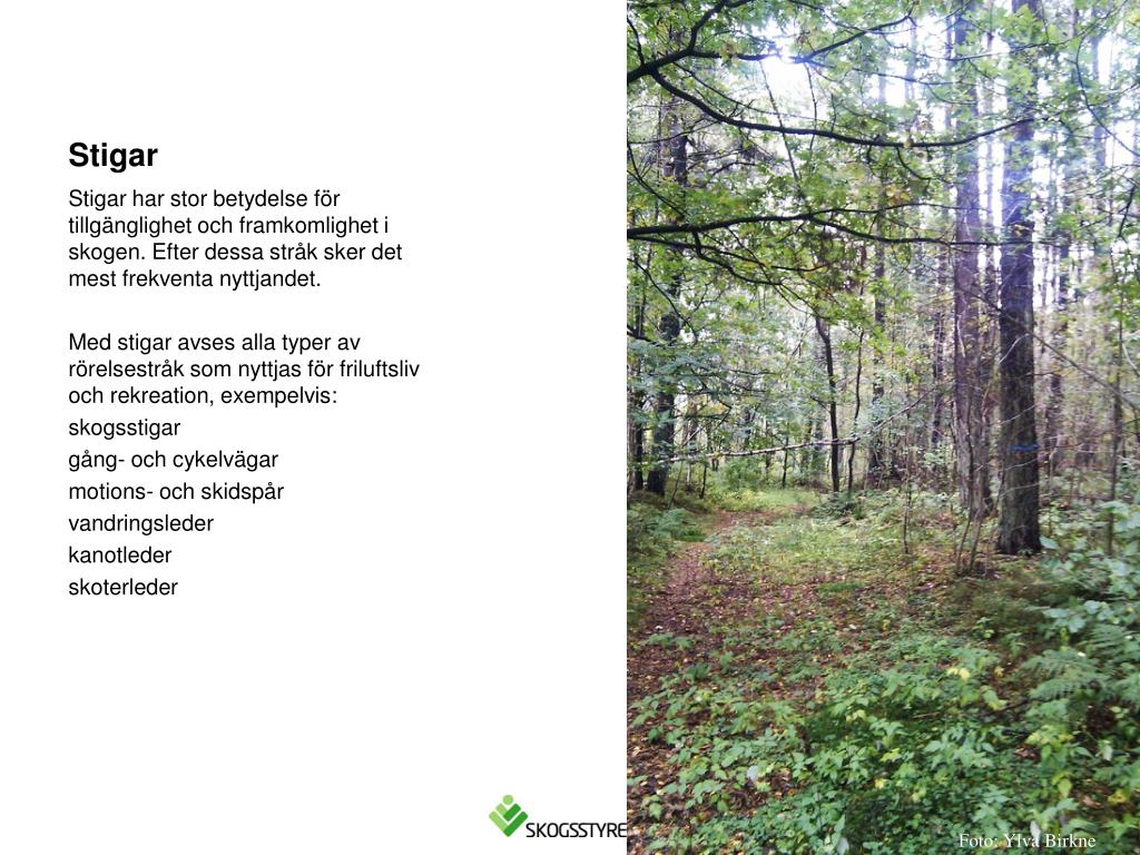 Stigar Stigar har stor betydelse för tillgänglighet och framkomlighet i skogen. Efter dessa stråk sker det mest frekventa nyttjandet. Med stigar avses alla typer av rörelsestråk som nyttjas för friluftsliv och rekreation, exempelvis: skogsstigar gång- och cykelvägar motions- och skidspår vandringsleder kanotleder skoterleder Foto: Ylva Birkne