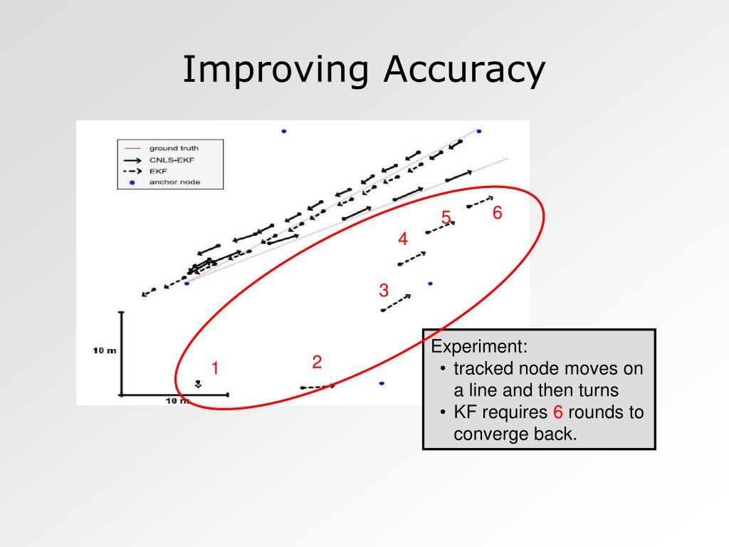 Improving Accuracy 6 5 4 3 • Experiment: • tracked node moves on a line and then turns • KF requires 6 rounds to converge back. 2 1