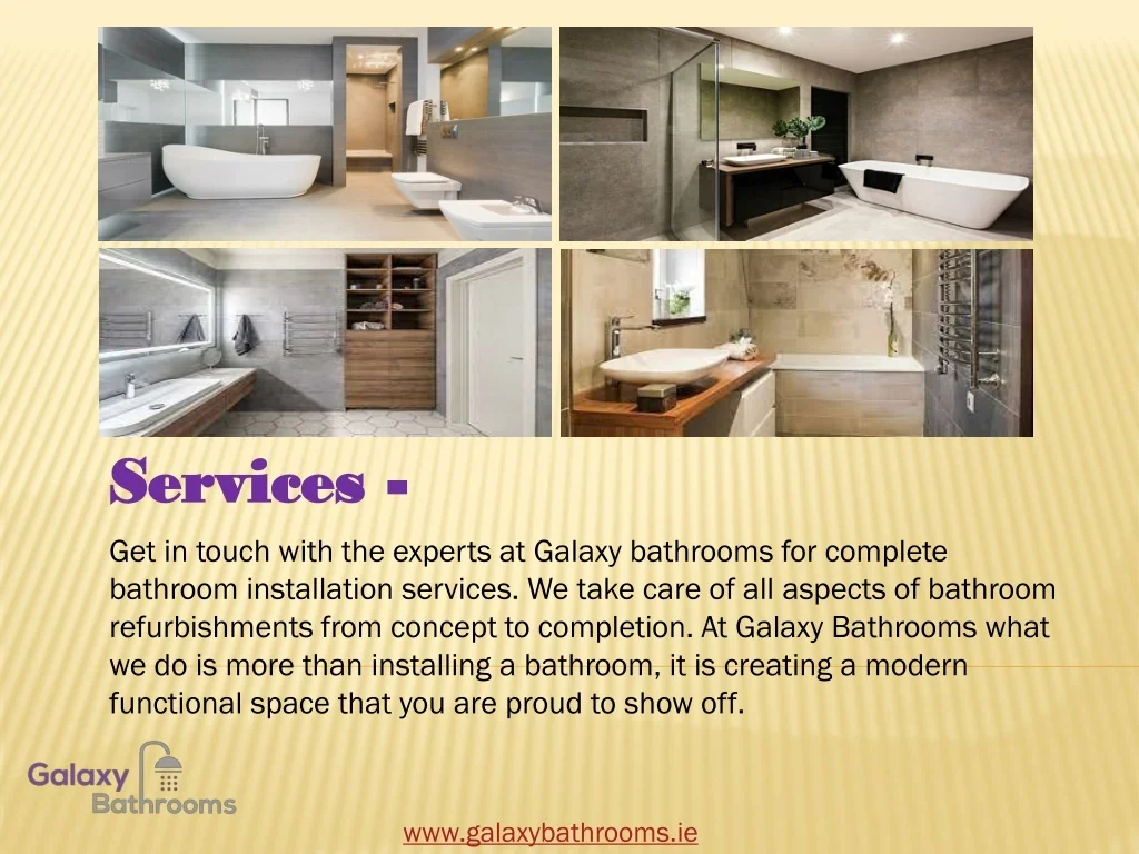 Services - Get in touch with the experts at Galaxy bathrooms for complete bathroom installation services. We take care of all aspects of bathroom refurbishments from concept to completion. At Galaxy Bathrooms what we do is more than installing a bathroom, it is creating a modern functional space that you are proud to show off. www.galaxybathrooms.ie