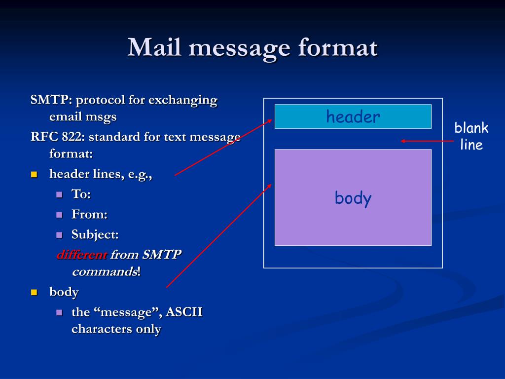 SMTP: protocol for exchanging email msgs RFC 822: standard for text message format: header lines, e.g., To: From: Subject: differentfrom SMTP commands! body the “message”, ASCII characters only Mail message format header blank line body