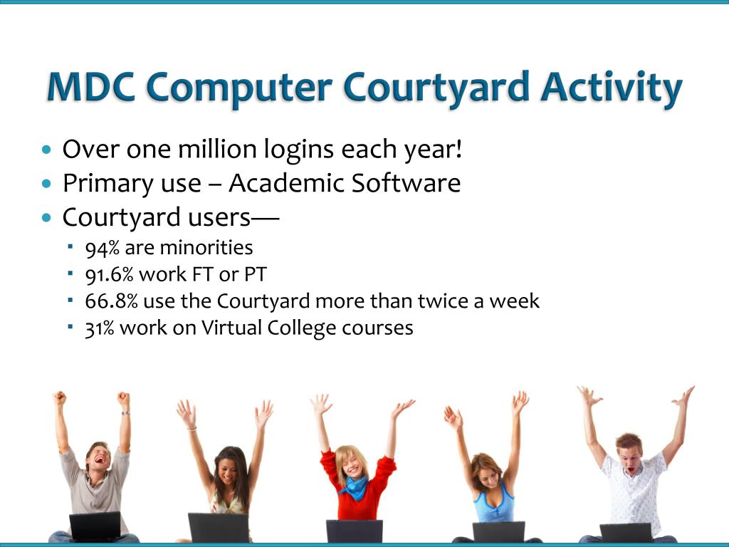 MDC Computer Courtyard Activity • Over one million logins each year! • Primary use – Academic Software • Courtyard users— • 94% are minorities • 91.6% work FT or PT • 66.8% use the Courtyard more than twice a week • 31% work on Virtual College courses