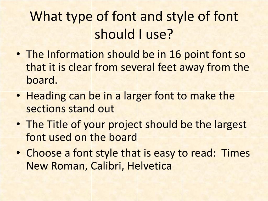 What type of font and style of font should I use? • The Information should be in 16 point font so that it is clear from several feet away from the board. • Heading can be in a larger font to make the sections stand out • The Title of your project should be the largest font used on the board • Choose a font style that is easy to read: Times New Roman, Calibri, Helvetica