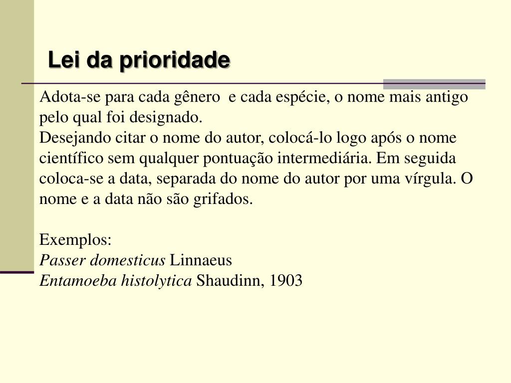 Lei da prioridade Adota-se para cada gênero e cada espécie, o nome mais antigo pelo qual foi designado. Desejando citar o nome do autor, colocá-lo logo após o nome científico sem qualquer pontuação intermediária. Em seguida coloca-se a data, separada do nome do autor por uma vírgula. O nome e a data não são grifados. Exemplos: Passer domesticus Linnaeus Entamoeba histolytica Shaudinn, 1903