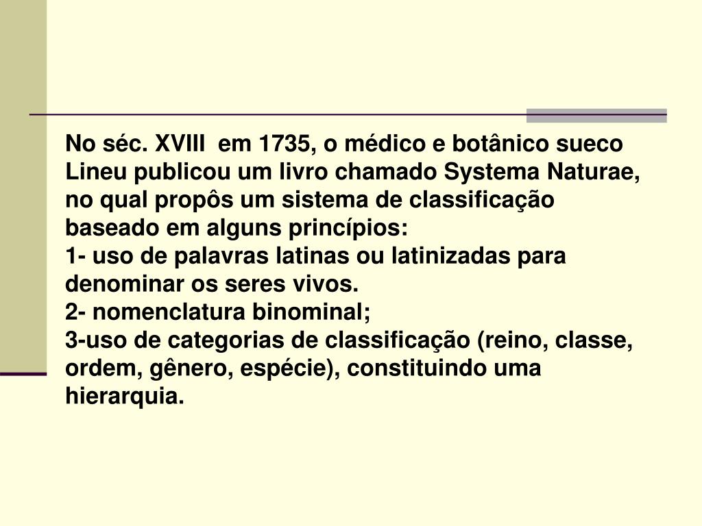 No séc. XVIII em 1735, o médico e botânico sueco Lineu publicou um livro chamado Systema Naturae, no qual propôs um sistema de classificação baseado em alguns princípios: 1- uso de palavras latinas ou latinizadas para denominar os seres vivos. 2- nomenclatura binominal; 3-uso de categorias de classificação (reino, classe, ordem, gênero, espécie), constituindo uma hierarquia.