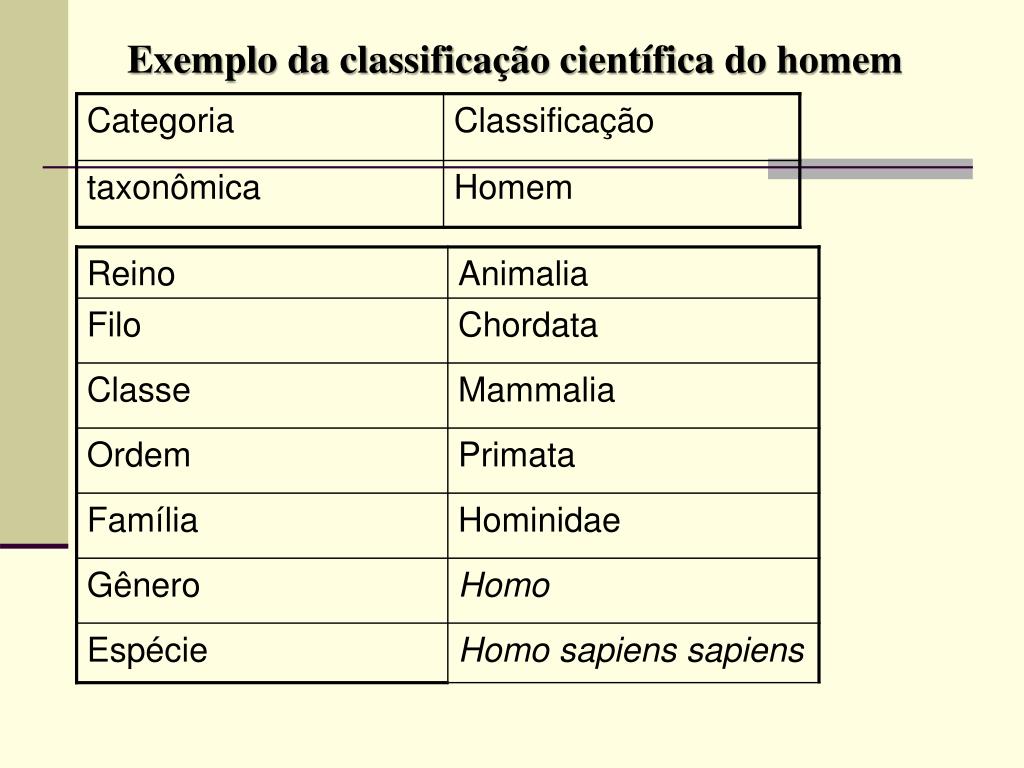 Espécies muito parecidas podem ser reunidas no grupo de gênero; gêneros afins formam famílias e estas compõem ordens, que se reúnem em classes. Os filos são compostos por classes semelhantes.Os diversos filos são reunidos em Reinos. ESPÉCIES - GÊNERO – FAMÍLIA – ORDENS – CLASSES – FILOS – REINOS EGFOCFR