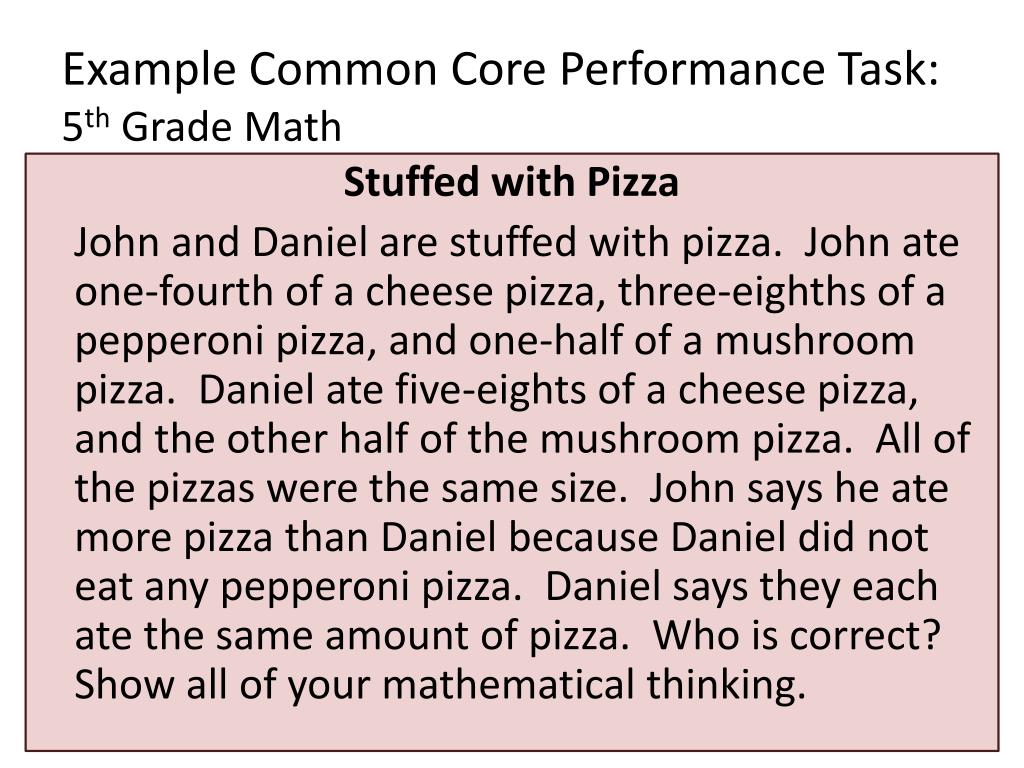 Example Common Core Performance Task: 5th Grade Math Stuffed with Pizza John and Daniel are stuffed with pizza. John ate one-fourth of a cheese pizza, three-eighths of a pepperoni pizza, and one-half of a mushroom pizza. Daniel ate five-eights of a cheese pizza, and the other half of the mushroom pizza. All of the pizzas were the same size. John says he ate more pizza than Daniel because Daniel did not eat any pepperoni pizza. Daniel says they each ate the same amount of pizza. Who is correct? Show all of your mathematical thinking.