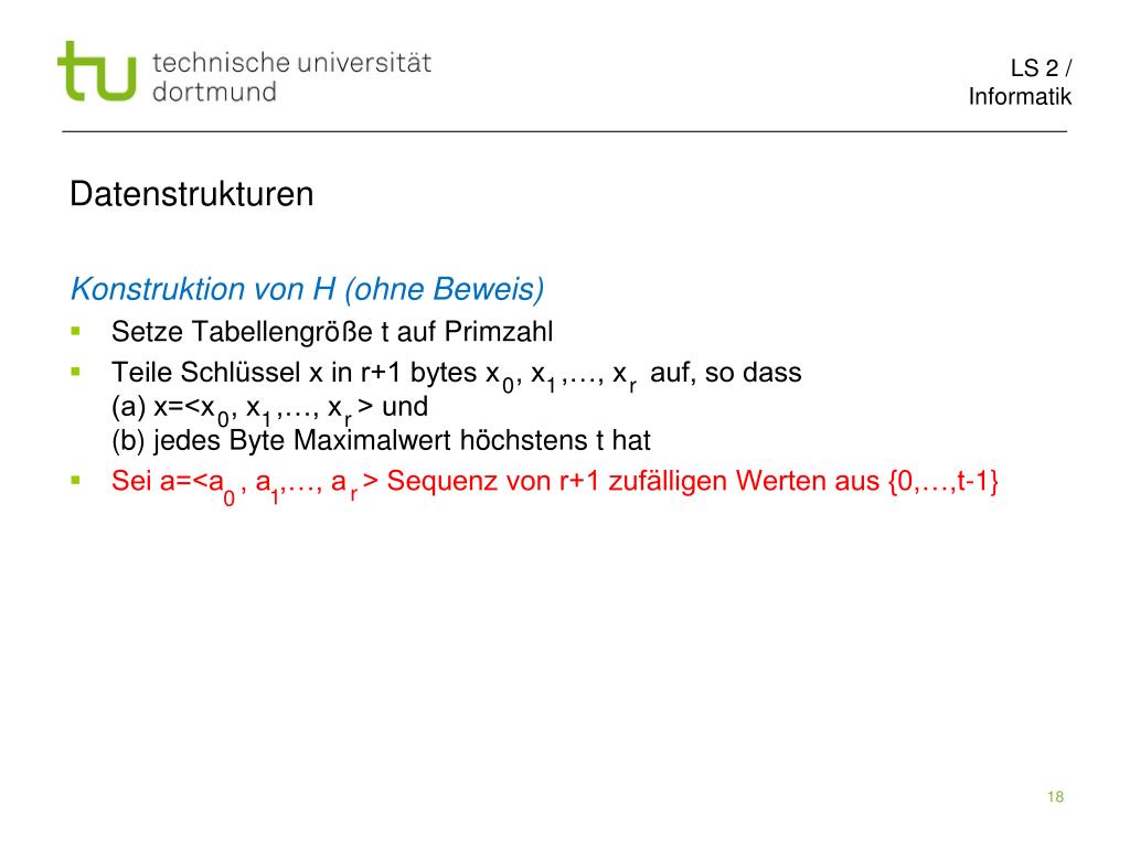 Datenstrukturen Konstruktion von H (ohne Beweis) • Setze Tabellengröße t auf Primzahl • Teile Schlüssel x in r+1 bytes x , x ,…, x auf, so dass(a) x=<x , x ,…, x > und(b) jedes Byte Maximalwert höchstens t hat • Sei a=<a , a ,…, a > Sequenz von r+1 zufälligen Werten aus {0,…,t-1} 0 1 r 0 1 r r 1 0