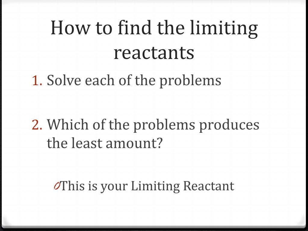 How to find the limiting reactants • Solve each of the problems • Which of the problems produces the least amount? • This is your Limiting Reactant