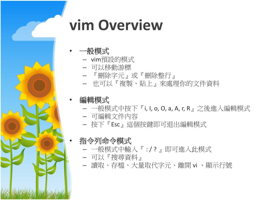 vim Overview • 一般模式 • vim預設的模式 • 可以移動游標 • 『刪除字元』或『刪除整行』 • 也可以『複製、貼上』來處理你的文件資料 • 編輯模式 • 一般模式中按下『i, I, o, O, a, A, r, R』之後進入編輯模式 • 可編輯文件內容 • 按下『Esc』這個按鍵即可退出編輯模式 • 指令列命令模式 • 一般模式中輸入『 : / ? 』即可進入此模式 • 可以『搜尋資料』 • 讀取、存檔、大量取代字元、離開 vi 、顯示行號
