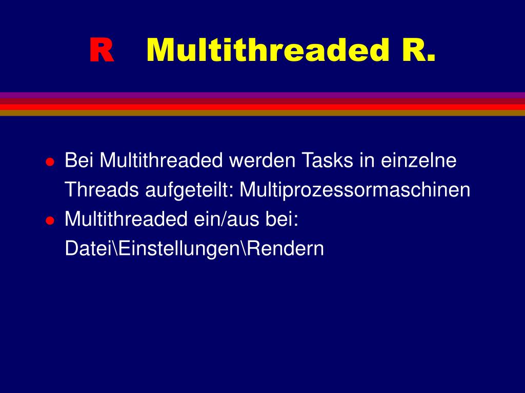 Bei Multithreaded werden Tasks in einzelne Threads aufgeteilt: Multiprozessormaschinen Multithreaded ein/aus bei: Datei\Einstellungen\Rendern R Multithreaded R.