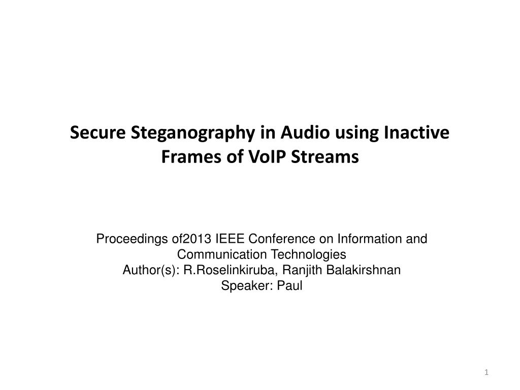 Secure Steganography in Audio using InactiveFrames of VoIP Streams Proceedings of2013 IEEE Conference on Information and Communication Technologies Author(s): R.Roselinkiruba, Ranjith Balakirshnan Speaker: Paul