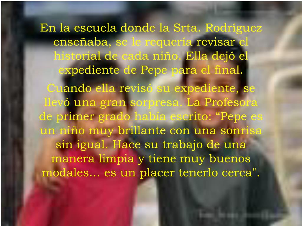 En la escuela donde la Srta. Rodríguez enseñaba, se le requería revisar el historial de cada niño. Ella dejó el expediente de Pepe para el final. Cuando ella revisó su expediente, se llevó una gran sorpresa. La Profesora de primer grado había escrito: “Pepe es un niño muy brillante con una sonrisa sin igual. Hace su trabajo de una manera limpia y tiene muy buenos modales... es un placer tenerlo cerca".