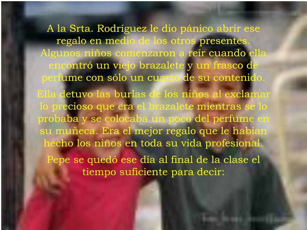 A la Srta. Rodríguez le dio pánico abrir ese regalo en medio de los otros presentes. Algunos niños comenzaron a reír cuando ella encontró un viejo brazalete y un frasco de perfume con sólo un cuarto de su contenido. Ella detuvo las burlas de los niños al exclamar lo precioso que era el brazalete mientras se lo probaba y se colocaba un poco del perfume en su muñeca. Era el mejor regalo que le habían hecho los niños en toda su vida profesional. Pepe se quedó ese día al final de la clase el tiempo suficiente para decir: