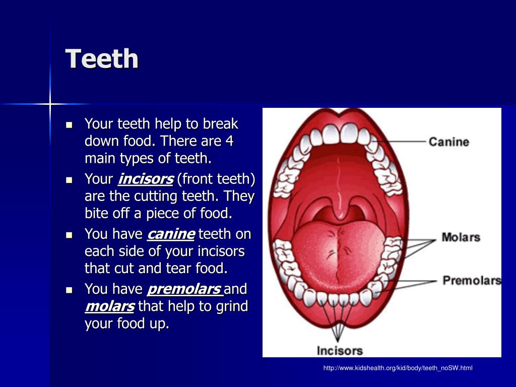 Teeth • Your teeth help to break down food. There are 4 main types of teeth. • Your incisors (front teeth) are the cutting teeth. They bite off a piece of food. • You have canine teeth on each side of your incisors that cut and tear food. • You have premolars and molars that help to grind your food up. http://www.kidshealth.org/kid/body/teeth_noSW.html