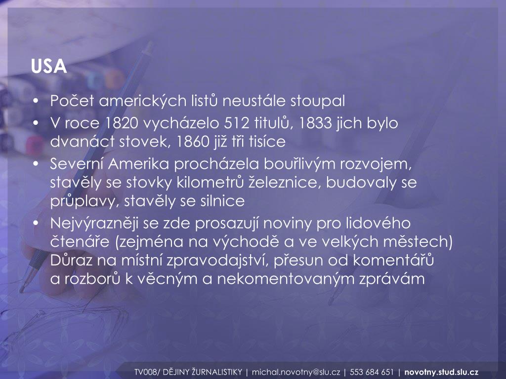 Počet amerických listů neustále stoupal • V roce 1820 vycházelo 512 titulů, 1833 jich bylo dvanáct stovek, 1860 již tři tisíce • Severní Amerika procházela bouřlivým rozvojem, stavěly se stovky kilometrů železnice, budovaly se průplavy, stavěly se silnice • Nejvýrazněji se zde prosazují noviny pro lidového čtenáře (zejména na východě a ve velkých městech)Důraz na místní zpravodajství, přesun od komentářů a rozborů k věcným a nekomentovaným zprávám USA TV008/ DĚJINY ŽURNALISTIKY | michal.novotny@slu.cz | 553 684 651 | novotny.stud.slu.cz