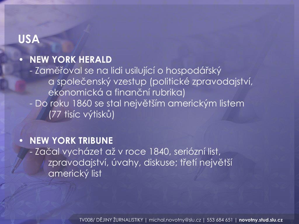 NEW YORK HERALD- Zaměřoval se na lidi usilující o hospodářský a společenský vzestup (politické zpravodajství, ekonomická a finanční rubrika)- Do roku 1860 se stal největším americkým listem (77 tisíc výtisků) • NEW YORK TRIBUNE- Začal vycházet až v roce 1840, seriózní list, zpravodajství, úvahy, diskuse; třetí největší americký list USA TV008/ DĚJINY ŽURNALISTIKY | michal.novotny@slu.cz | 553 684 651 | novotny.stud.slu.cz