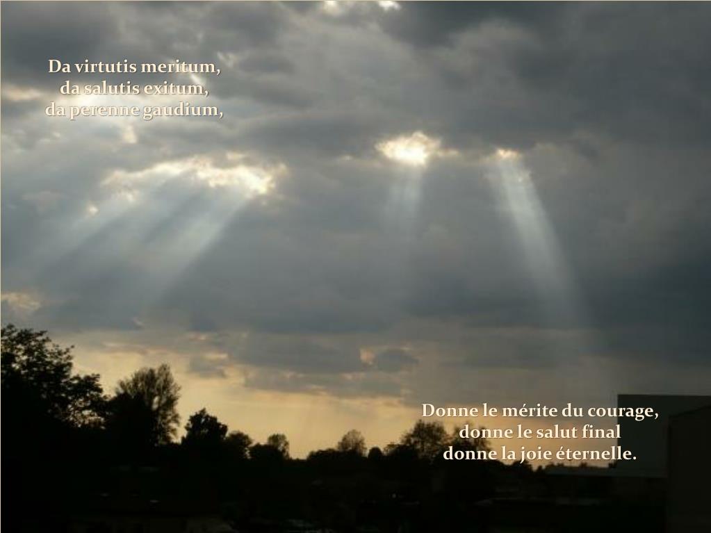 Da virtutis meritum, da salutis exitum, da perenne gaudium, • Donne le mérite du courage, donne le salut final donne la joie éternelle.