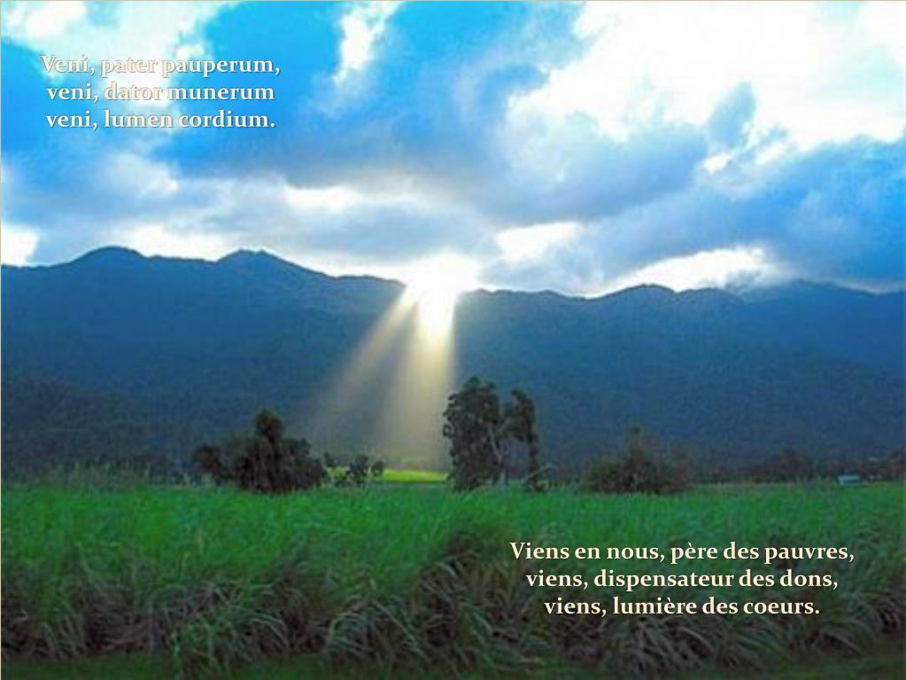 Veni, pater pauperum, veni, dator munerum veni, lumen cordium. • Viens en nous, père des pauvres, viens, dispensateur des dons, viens, lumière des coeurs.