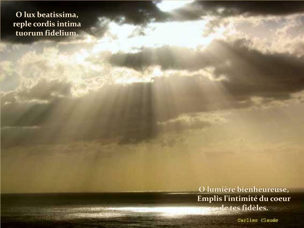 O lux beatissima, reple cordis intima tuorum fidelium. • O lumière bienheureuse, Emplis l'intimité du coeur de tes fidèles.
