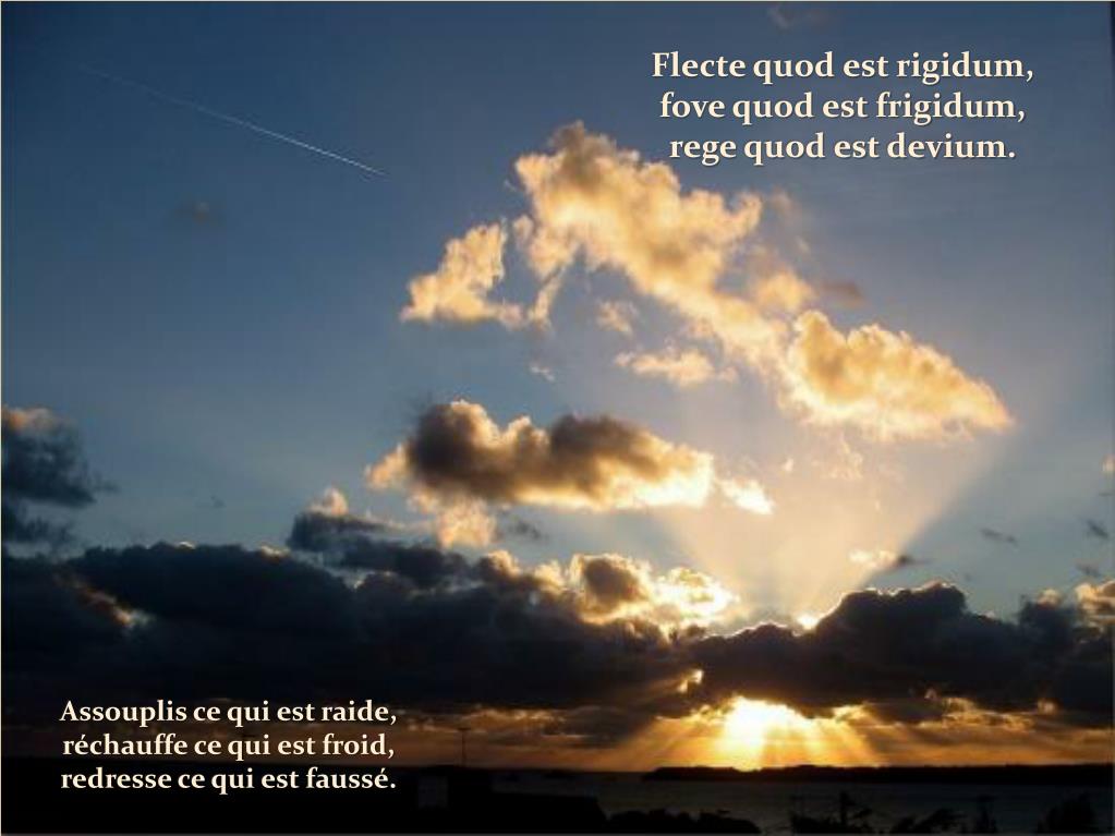 Flecte quod est rigidum, fove quod est frigidum, rege quod est devium. • Assouplis ce qui est raide, réchauffe ce qui est froid, redresse ce qui est faussé.