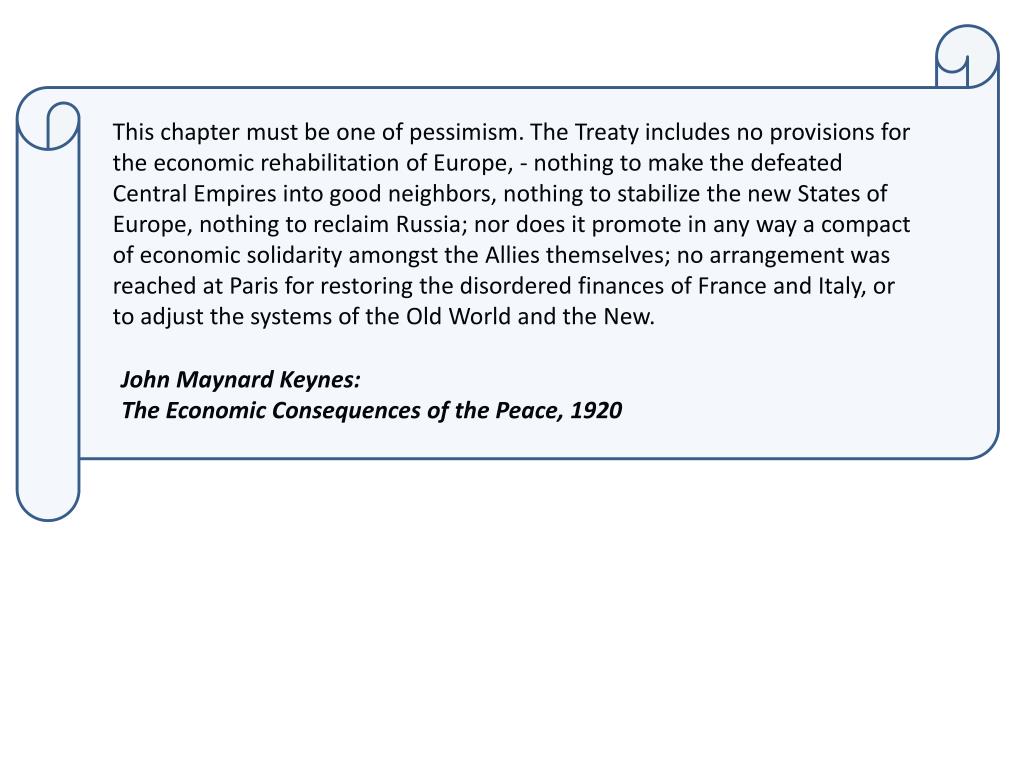 This chapter must be one of pessimism. The Treaty includes no provisions for the economic rehabilitation of Europe, - nothing to make the defeated Central Empires into good neighbors, nothing to stabilize the new States of Europe, nothing to reclaim Russia; nor does it promote in any way a compact of economic solidarity amongst the Allies themselves; no arrangement was reached at Paris for restoring the disordered finances of France and Italy, or to adjust the systems of the Old World and the New. John Maynard Keynes: The Economic Consequences of the Peace, 1920