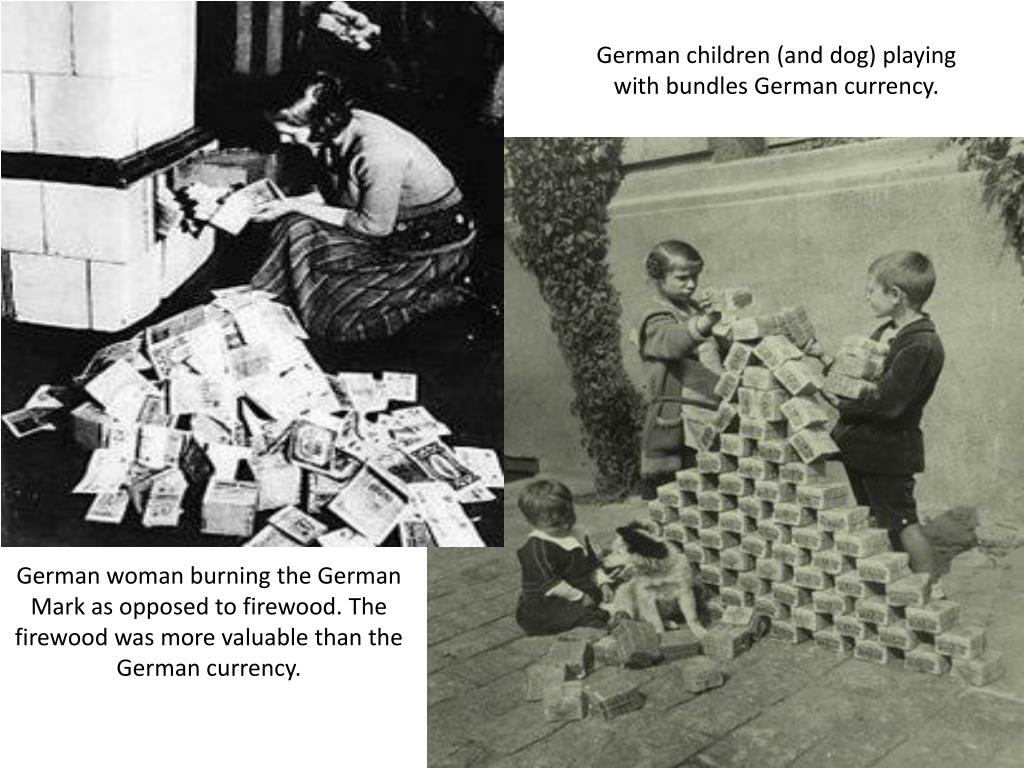 German children (and dog) playing with bundles German currency. German woman burning the German Mark as opposed to firewood. The firewood was more valuable than the German currency.