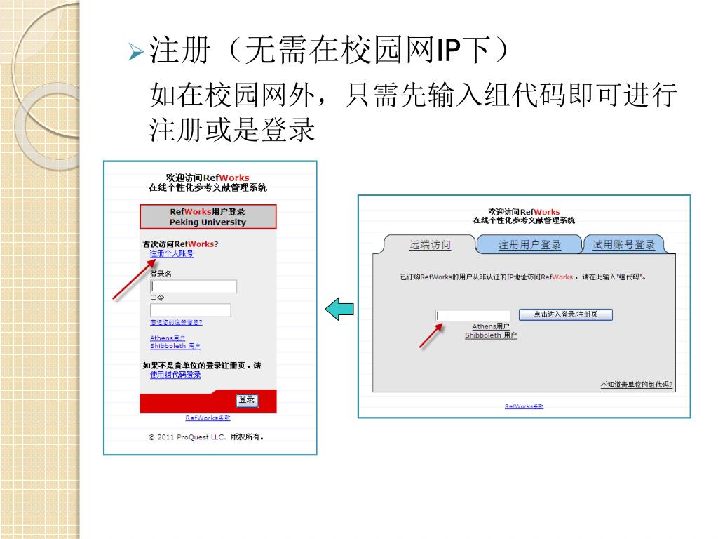 在校园网IP下可以直接点击进入,或者进入镜像站点在校园网IP下可以直接点击进入,或者进入镜像站点 • 如不在校园网IP下,则先在登陆界面输入组代码: rwpekingu,然后再进行正常登陆 • 或是直接输入网址: https://www.refworks.com/Refworks 请收藏一下这个地址吧~
