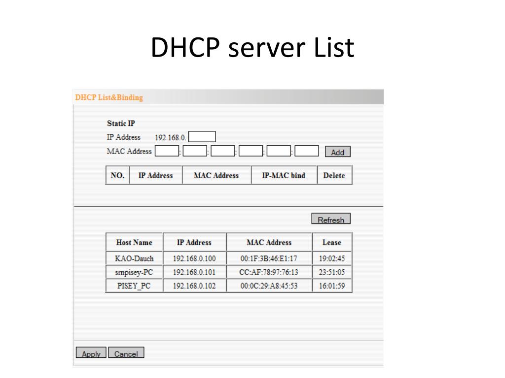 DHCP Server • DHCP (Dynamic Host Configuration Protocol) is to assign an IP address to the computers on the LAN/private network. When you enable the DHCP Server, the DHCP Server will allocate automatically an unused IP address from the IP address pool to the requesting computer in premise of activating “Obtain an IP Address Automatically”. So specifying the starting and ending address of the IP Address pool is needed. The lease time is the length of the IP address lease.