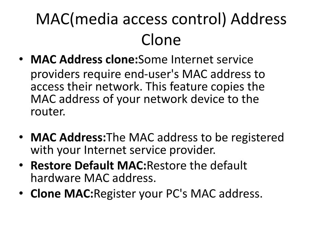 MAC(media access control)Address Clone • MAC Address clone:Some Internet service providers require end-user's MAC address to access their network. This feature copies the MAC address of your network device to the router. • MAC Address:The MAC address to be registered with your Internet service provider. • Restore Default MAC:Restore the default hardware MAC address. • Clone MAC:Register your PC's MAC address.
